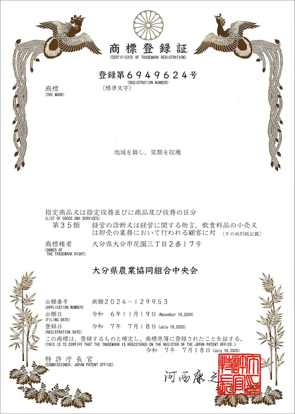 「地域を耕し、笑顔を収穫」が令和7年7月18日付で、特許庁より商標登録されました。
